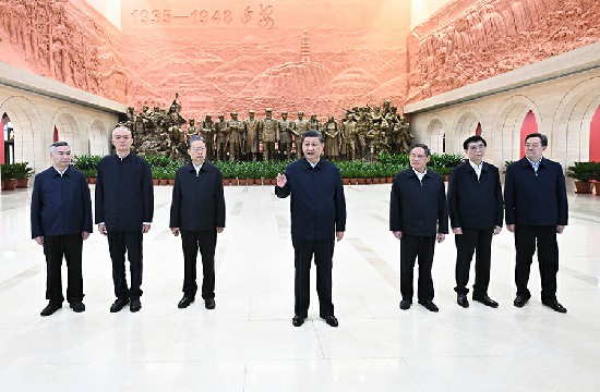 10月27日,中共中央总书记、国家主席、中央军委主席习近平带领中共中央政治局常委李强、赵乐际、王沪宁、蔡奇、丁薛祥、李希,瞻仰延安革命纪念地。这是习近平等在延安革命纪念馆,参观《伟大历程——中共中央在延安十三年历史陈列》。 新华社记者 鞠鹏 摄